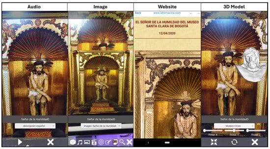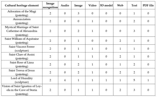 From the analysis of these studies, the types of media used to represent heritage content in augmented reality were identified, as presented in Table 1. The analysis reveals that none of these studies use PDF files, while the most-employed media are texts. For example, the related works [,] use 3D models to reconstruct elements that have disappeared or are degraded, complementing information that would not be possible to visualize with other types of media. In the case of videos, the related works [,,] use them to provide details about artworks displayed in museums.