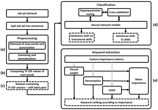 - Determining relevant keywords (Figure 1e): We identify the key terms that are most closely associated with each transversal skill by analyzing the importance of each word for identifying that skill through classification. Using each classifier, we determine the significance of each word by measuring the importance of its corresponding TF-IDF score as a feature for recognizing the related skill. We use three metrics, namely NeuralWeight, Permutation, and SHAP, as well as their mean value, for determining the feature importance of each word, and then we rank the words according to their related feature importance when identifying the corresponding transversal skill. Thus, we obtain sets of keywords that we find to be most closely associated with each transversal skill, as resulting from our datasets and corresponding classifiers.