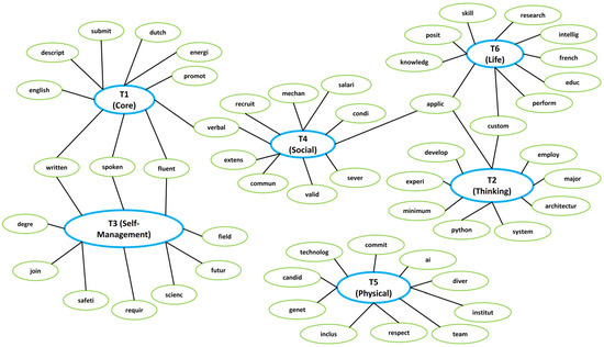 The chart from Figure 3 illustrates the relationships among the 10 most important root words and their corresponding transversal skills. The chart’s layout highlights significant patterns, particularly the clustering of communication-related keywords around T1 and T4, and technical terms near T2 and T6. It also demonstrates how self-management (T3) connects organizational skills to broader collaborative and analytical contexts, while physical skills (T5) maintain distinctiveness yet rely on communication for integration. This visual representation highlights the interconnected nature of transversal skills, illustrating how competencies often complement each other rather than functioning in isolation. The analysis reveals that while certain skills exhibit specialization, overlaps indicate shared traits that can facilitate multi-domain competence development.
