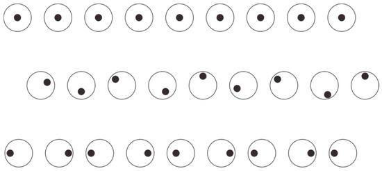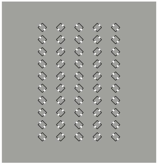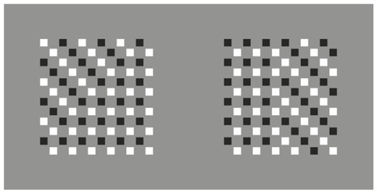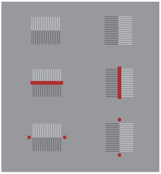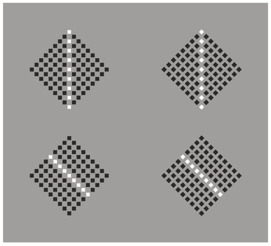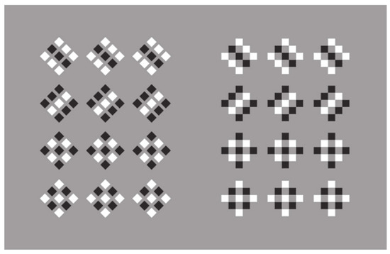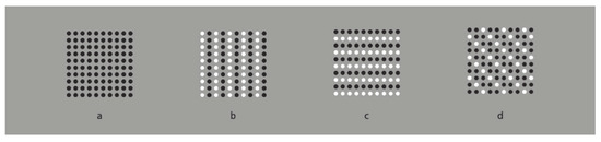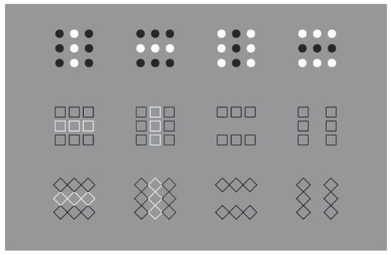 To modify the stability of Figure 1 while preserving the proximity principle, it is sufficient to introduce another type of dissimilarity between the rows and columns. In Figure 1b,c, the elements are grouped differently by reversing contrast polarity, using black and white elements on a gray background. Similar effects can be achieved by altering color, shape, or other perceptual features, although contrast polarity produces the most significant dissimilarity and change in perceptual organization due to the stark differences in luminance [8].