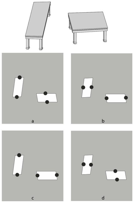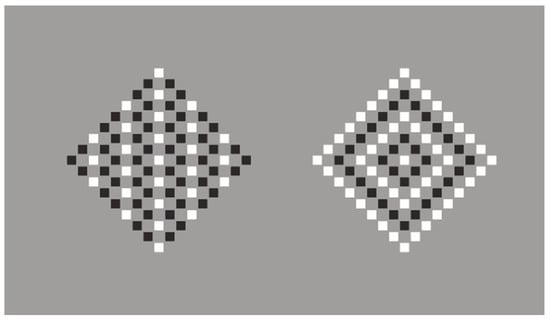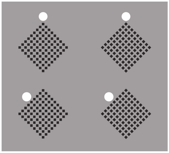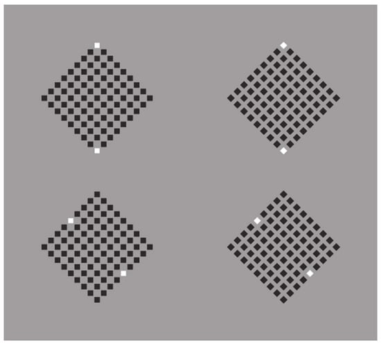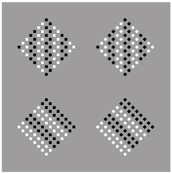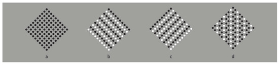 Specifically, in Figure 3a,d, the matrices appear globally not as rotated squares but as diamonds, unlike the conditions illustrated in Figure 3b,c, which instead seem like squares rotated 45 degrees, the first rotated counterclockwise and the second clockwise. In the case of the diamonds, however, no orientation is perceived other than the canonical one, which belongs to the diamond, which is not a rotated square. Nevertheless, there is a substantial difference between Figure 3a,d regarding the grouping of the dots. In Figure 3a, they appear grouped according to the principle of proximity, while in Figure 3d, both black and white dots follow the larger distances along the diagonals. Thus, the appearance of Figure 3d as a diamond is significantly more pronounced compared to Figure 3a.