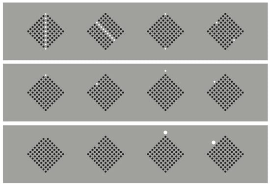 By modifying Figure 3 as shown in Figure 5, through a gradual reduction in perceptual groupings until reaching extreme conditions, such as those where the number of white dots is reduced to two, positioned at opposite corners of the dot matrix, or even to a single dot, as seen in the first and second stimuli of the second row in Figure 5, the change in the global shape from a diamond to a rotated square can be easily observed, similar to the effects perceived in Figure 3.