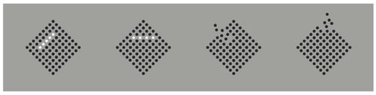 The rotated square-diamond phenomenon can also be accentuated as illustrated in Figure 6. In this case as well, the grouping of the individual dots follows the accentuated property and direction, that is, the rotated square or the diamond. This entails that it is the accentuation that determines the grouping of the individual dots, independently of and against Wertheimer’s principles [19]. Accentuation provides the configuration of elements with an entirely new structure.