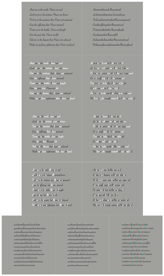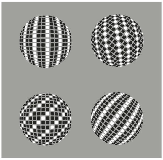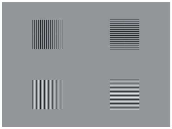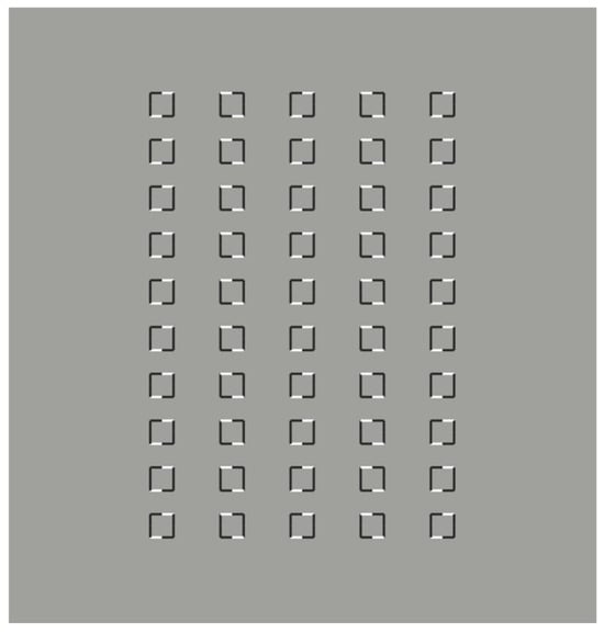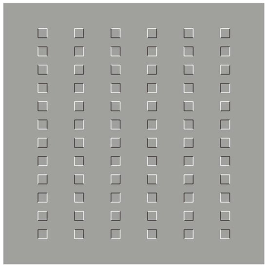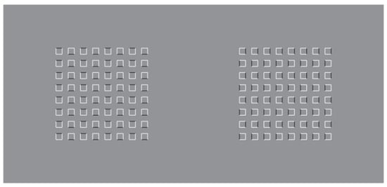 If all this is true, then we could easily achieve an even more intense effect of elongation or widening than those shown both in Figure 2 and in the Helmholtz square. It is simply a matter of multiplying the accentuated directions resulting from the grouping of elements, as illustrated in Figure 20 [18,19].