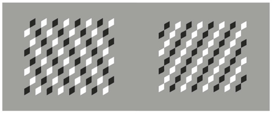 In Figure 1, the synergistic interaction between similarity and dissimilarity, as predicted by Wertheimer, leads to the perception of rows, columns, or diagonals. But there is more. Returning to Figure 1b,c, by focusing attention on 3 × 3 sub-matrices within each global matrix, engaging in non-immediate perceptual processes, and comparing them, something not immediately apparent can be observed. This is an illusory phenomenon of elongation and widening, respectively, following the direction emerging from the grouping as reported by human subjects. Based on human descriptions, perceptual organization, contrary to Wertheimer’s claim, does not end with grouping but can lead to other related phenomena.