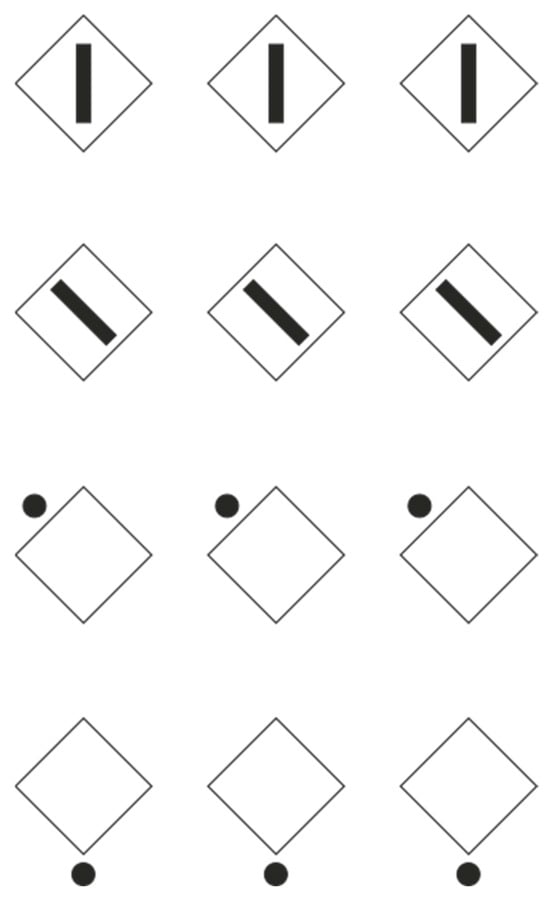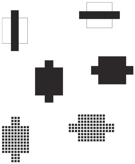 However, as suggested, the contradiction is only apparent. In fact, it is not just the horizontal or vertical segments of the Helmholtz square that determine the perceived shape, but the arrangement or grouping of elements that holistically defines the form. Whether they are segments, dots, squares, or diamonds, the result remains the same. Thus, since the arrangement of the horizontal segments in the Helmholtz square is vertical, the result will be a vertical rectangle. The opposite occurs in the case of vertical segments arranged horizontally. This is equivalent to the conditions illustrated in Figure 2 [18].