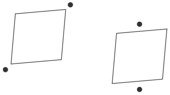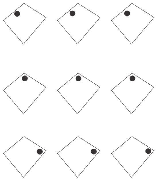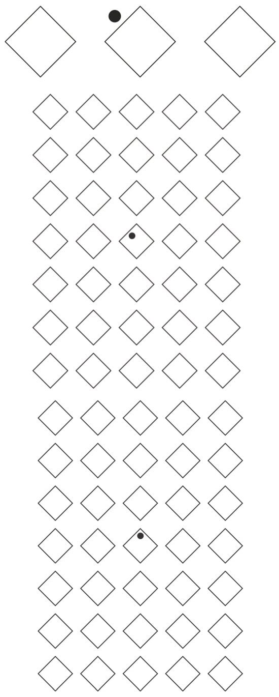 It is noteworthy that these effects persist even when a white dot of varying size is added outside the complete matrix or when one of the dots in the matrix is removed. Consequently, if the dissimilarity appears on one side of the matrix, a rotated square is perceived; if it appears at a corner or adjacent to it, a diamond is perceived. It seems as though the dissimilarities accentuate either the sides or the corners, thus emphasizing the flattening effect (sidedness) due to the phenomenological characteristics of the sides or the sharpness (pointedness) inherent to the corners and vertices of the matrix [17,18,19].