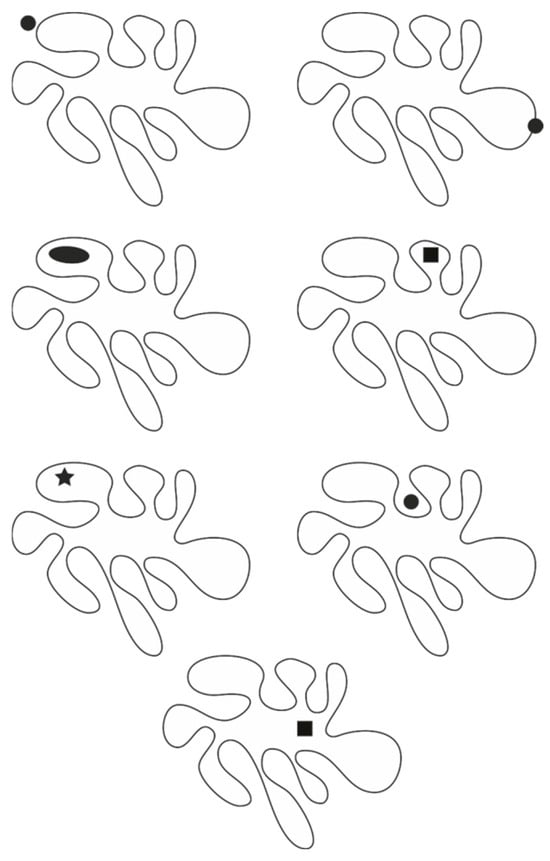 Figure 5, Figure 6, Figure 7, Figure 8 and Figure 9 demonstrate how even minimal accentuation can dramatically alter perception. Grossberg’s theory explains this through the concept of “symmetry-breaking” in neural networks [42]. A single accent creates an asymmetry in the BCS activation, which is then amplified through recurrent processing in the laminar cortical circuits. The ART component of the theory is crucial here [11,39]. The accent serves as a highly salient feature that rapidly activates a specific categorical representation (e.g., “diamond” or “rotated square”). Once activated, this category sends strong top–down signals that reshape the processing of the entire figure, even in regions far from the accent. The FACADE theory’s explanation of figure-ground separation is also relevant [40]. The accent influences the assignment of border ownership, affecting how the visual system interprets the object’s shape and its relation to the background.
