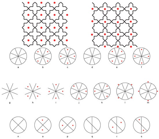 To achieve a complete detachment, it is necessary to work on a single element rather than on groups. To this end, consider the conditions illustrated in Figure 16, where the introduction of dissimilar elements inside (black rectangles) or outside (dots) geometric squares results in the accentuation of direction or position relative to the geometric shapes along the sides or angles, giving rise to the rotated square-diamond effect.