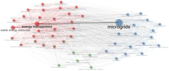 The first cluster (in red) is identified as “energy management”, including key nodes such as “renewable energy resources”, “electric power transmission networks”, “smart power grids”, “optimization”, “scheduling”, “energy efficiency”, “stochastic systems”, “distributed energy resources”, “smart grid”, and “distributed power generation”. The presence of these terms highlights the diversity and breadth of the subject matter, demonstrating a comprehensive approach that encompasses efficient energy management, the implementation of smart grids, and the use of renewable resources.