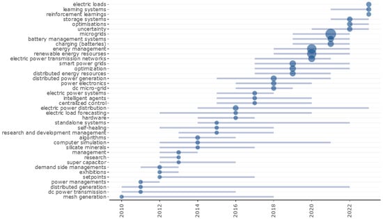 Trend topics are derived from a statistical analysis where the size of the circles indicates the frequency with which a term appears in documents. The length of the line reveals the years during which the term has been used in research. Figure 2 shows that the topics with the highest frequency of mentions, whose median and third quartile are concentrated in the last five years, are microgrids (6587 mentions), energy management (4352 mentions), and renewable energy resources (4058 mentions). This highlights their consistent and growing relevance in transitioning to sustainable energy systems. Furthermore, topics such as reinforcement learning, electric loads, and learning systems, with data concentrated in 2023, reflect the rise of innovative technologies driven by advances in artificial intelligence and data analytics.