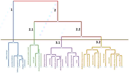 The dendrogram of this study is presented in Figure 3. Upon examination, six main nodes are identified, four of which have differentiated branches: nodes 1, 2.1, 3.1, and 3.2. Each node is distinguished by a unique color palette (blue for node 1, green for node 2, purple for 3.1, and magenta for 3.2). These primary nodes structure the dendrogram hierarchy and reveal specific thematic relationships.