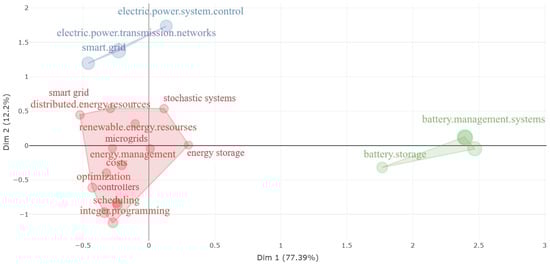 Dimensions Dim 1 and Dim 2 capture significant variations in the data, reflecting subtle similarities and differences between the analyzed terms. The coexistence of terms related to energy control and transmission in Dim 2, along with the grouping of terms associated with energy storage and management in Dim 1, suggests a discernible thematic organization. The presence of isolated terms, such as “distributed energy resources” and “distributed power generation”, adds an additional layer of complexity, possibly indicating unique or less explored areas in the dataset.
