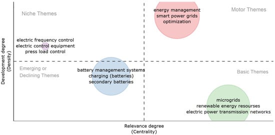 Cluster 1, located at the upper right side of the figure, includes the terms “Energy Management”, “Smart power grids”, and “optimization”. This cluster focuses on energy management. It is considered a driving or motor theme, which is the basis for emerging themes. Cluster 2, located at the lower left of Figure 5, focuses on battery management systems and includes the expressions “Battery Management Systems”, “charging (batteries)”, and ”secondary batteries“. This represents an emerging theme.