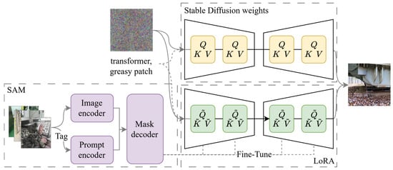 Although the above studies have achieved valuable research results, in transformer fault detection scenarios, GAN-based image data augmentation models exhibit challenges such as training instability and insufficient condition control. Meanwhile, DDPM-based image augmentation requires immense computational power, with training large diffusion models typically demanding hundreds of GPU days (e.g., requiring 150–1000 V100 GPU days, as reported in [12]). To address these challenges, this paper proposes a transformer image data augmentation method based on the Stable Diffusion model, integrating Low-Rank Adaptation (LoRA) [21] and the Segment Anything Model (SAM) [22]. By fine-tuning the weights of the pre-trained Stable Diffusion model, the proposed method enables transformer image data augmentation with low dataset requirements, reduced computational demands, and enhanced condition controllability. These findings significantly advance substation equipment abnormality detection technology.