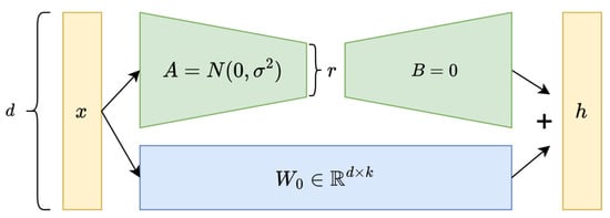 Specifically, let the parameter matrix of the pre-trained model be . LoRA achieves fine-tuning by adding a low-rank matrix , where , , and . The updating process can be expressed as Equation (3).