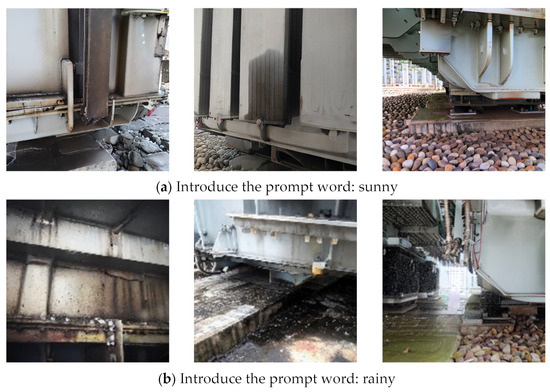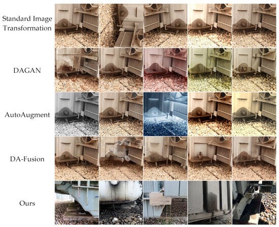 Through the data augmentation strategy described above, the proposed model was used to augment the original dataset. Conditional controls were applied to ensure a roughly balanced number of samples for each class, while incorporating both rainy and sunny conditions in the simulation. After augmentation, the dataset included 580 images under normal conditions, 290 images under sunny conditions, and 290 images under rainy conditions, in addition to 120 original images, resulting in a total of 1280 images. This was consistent with the number of images produced by conventional image augmentation methods (as detailed in Section 3.1.1). Since comparative models such as DAGAN [5] and AutoAugment [15] cannot perform condition-guided image augmentation, the dataset was expanded to 1280 images by augmenting each image multiple times. DA-Fusion [13] is capable of performing single-class condition augmentation, so the dataset was balanced in terms of class distribution using single-class conditional controls, and the total number of images was expanded to 1280 for the experiments. Examples of the expanded results for each data augmentation method are shown in Figure 10.