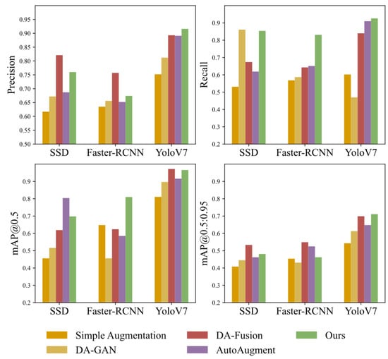 After data augmentation, we trained several commonly used object detection models, including SSD, Faster-RCNN, and YOLOv7. Some YoloV7 detection results on real and generated images are shown in Figure 11. The results indicate a significant improvement in performance metrics across all models (as shown in Figure 12 and Table 8). Among them, the YOLOv7 model stands out with a Precision of 0.916 and a Recall of 0.926. Notably, the proposed model outperforms DA-Fusion, a data augmentation method based on the Stable Diffusion model, in terms of Recall rate, suggesting a greater advantage in reducing false negatives. However, DA-Fusion excels in Precision. This phenomenon may be attributed to the higher similarity between the augmented data and the original data (as shown in Figure 10). Additionally, DA-Fusion can only generate single-class images, and when negative samples are more prevalent in the original dataset, the number of negative samples may exceed that of positive samples. In such cases, the model tends to predict more negative samples to minimize the misclassification of positive samples, thus improving Precision. In contrast, the proposed model generates more diverse and representative data, encompassing various objects and their performance under different weather conditions, leading to improved Recall.