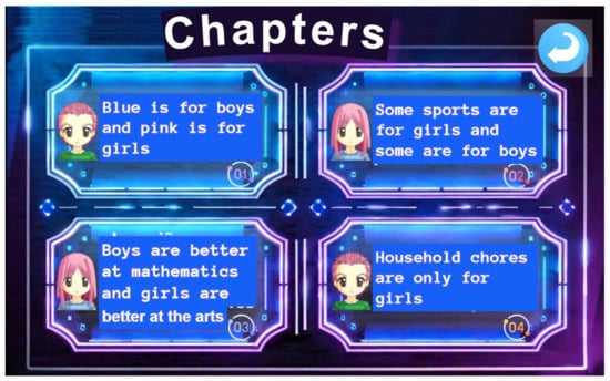 Figure 1 shows the four Kiddo chapters as displayed in the game, including the topics introduced in Section 2.3 about Colors, Studies, Sports, and Household activities. Table 1 presents the gender stereotypes addressed in each of the game chapters.