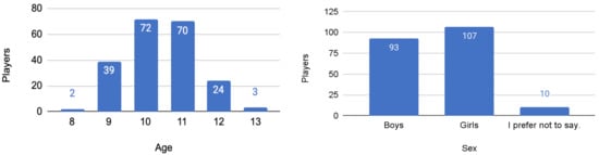 Finally, 210 students completed the three stages of the study (pre-test, video game play, and post-test). Their age distribution is depicted in Figure 2 (left), with most participants being 10 or 11 years old. Per school grade, 55 participants were in fourth grade, 85 in fifth grade, and 70 in sixth grade. Figure 2 (right) shows the participants’ sex: 93 boys, 107 girls, and 10 who chose not to disclose it. The almost equal distribution between boys and girls allows us to obtain more representative and accurate results.