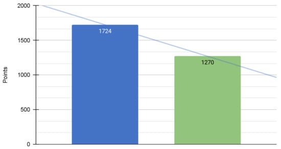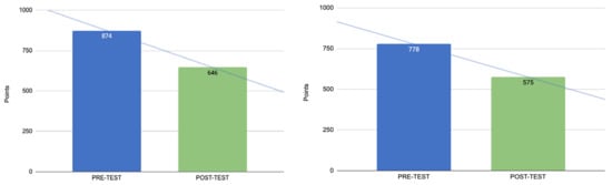To answer this question, based on the 5-point scale for each of the four statements, we calculate the score by combining the scores for all students in all four sexist behavior statements. For our study, the maximum number of points in a group of 210 players with a sexist attitude (5 on a Likert scale) in all four questions would be 4200 points (1050 for each question); on the other hand, 210 people with a non-sexist attitude (1 in scale) in all questions would score a minimum of 840 points (210 each). In Figure 3, we observe an initial higher level of sexist behavior (1724 points), which decreases after playing the Kiddo video game (1270 points) by a total of 454 points.