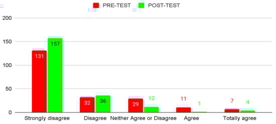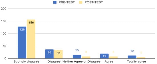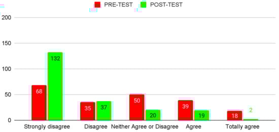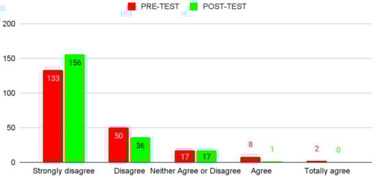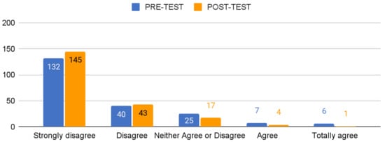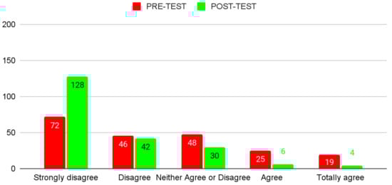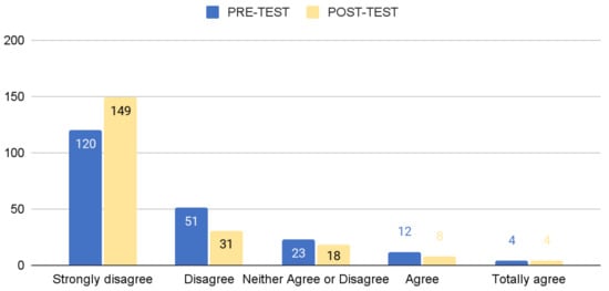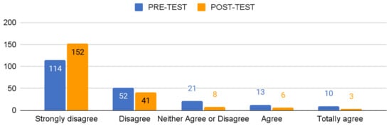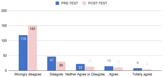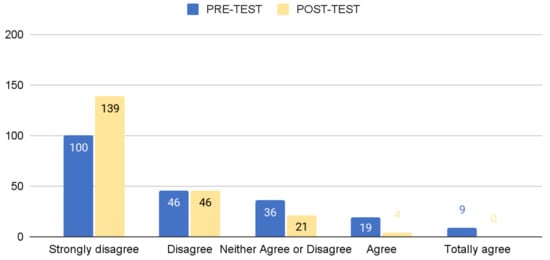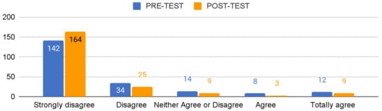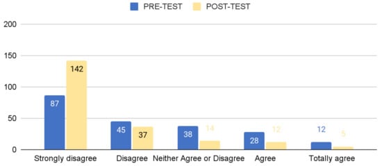 Acceptance of the video game was analyzed from the results of the post-test statement “Activity with the game is fun”. Of the 210 players who answered, 31 players did not find learning about equality through a video game enjoyable, while the majority of 171 players (81.4%) expressed that they did enjoy and found learning through this modality entertaining. The remaining eight players maintained a neutral stance on the matter.