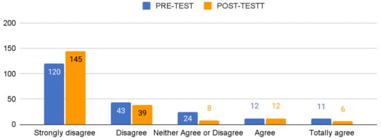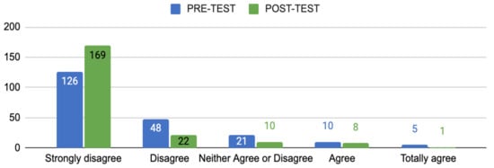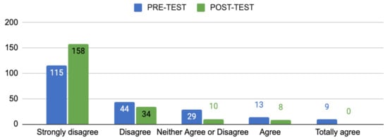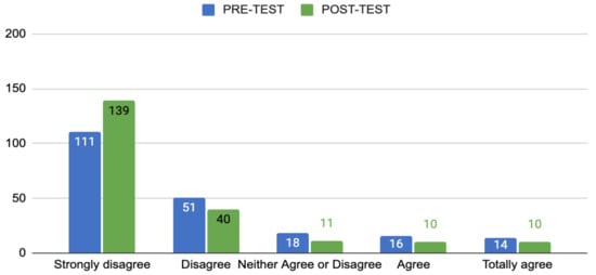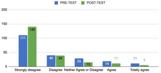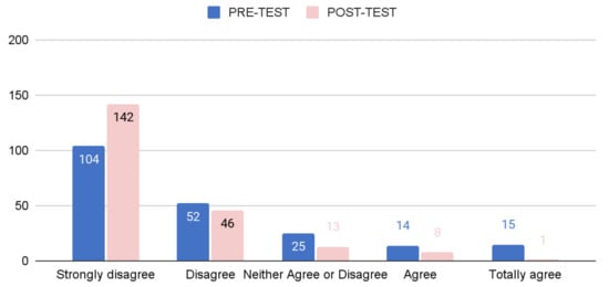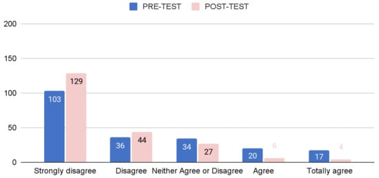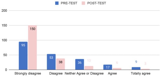 The response values in the gender stereotypes questionnaire may be summed to obtain a global score that reflects each participant’s general awareness of gender stereotypes [35]. A higher score indicates a higher agreement with the stereotypes, i.e., a lower awareness. The expected scenario was to reduce the global score (sum of all individual statement responses on the Likert scale) in the gender stereotypes post-test questionnaire compared to the pre-test. This will indicate that Kiddo delivers an educational message on gender equality, as stereotypes are one of the many forms in which gender inequalities are present [3].