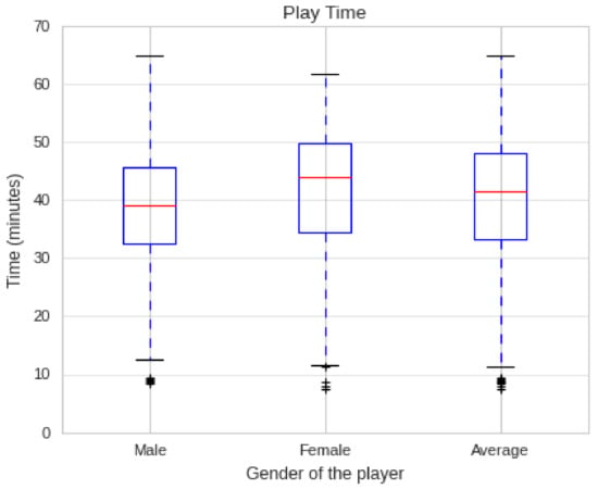 Results show an average play time of 39 min with 50% of the participants ranging between 33 and 48 min (Figure 25). The maximum play time was around 65 min, in which cases the gameplay was interrupted by the researcher due to the school’s limited timeframe. Figure 25 also displays the differences by gender in the gameplay, showing an average 4-min longer play time in female players.