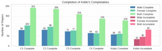 Number of players that completed each of the completables, including all chapters and the complete Kiddo game.