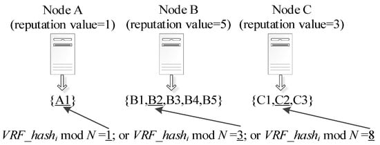 As shown in Figure 2, there are three nodes in the current network, the names of the three nodes are A, B, C, the reputation values of the nodes are 1, 5, and 3, and the number of child nodes are one, five, and three, respectively. When using VRF to select the primary node, the value of is the number of child nodes in the network. Here, the total number of nodes . When using the value of modulo operation for mapping, the nodes are sorted according to the node number size. The node A contains one child node {A1}. The node B contains five child nodes {B1, B2, B3, B4, B5}. The node C contains three child nodes {C1, C2, C3}. The modulo operation with a value of 1 is mapped to node 1, the modulo operation with a value of 3 is mapped to node 2, and the modulo operation with a value of 8 is mapped to node 3. With this scheme, it is easier for nodes with a high reputation value to be selected as primary nodes. The algorithm of the primary node selection is as depicted in Algorithm 1.