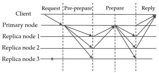 The five phases of the PBFT are request, pre-prepare, prepare, commit, and reply. The execution process is shown in Figure 1, and the specific steps are as follows.