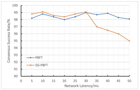 From the experimental results, it can be seen that when the network latency is below 30 milliseconds (ms), the 5G-PBFT has a similar or even higher consensus success rate compared with PBFT. However, when the latency exceeds 30 ms, the consensus success rate of 5G-PBFT starts to decline. In contrast, the consensus process of PBFT features strong stability. Even if the network latency increases to some extent, it can still ensure that all nodes successfully reach a consensus. As the 5G-PBFT eliminates the commit phase to improve efficiency, its nodes cannot reach a consistent state, when the network latency exceeds 30 ms. Therefore, the 5G-PBFT is feasible, when the network latency is below 30 ms.