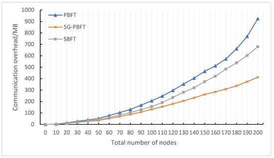 Compared with SBFT, 5G-PBFT reduces the number of communications, since there is no commit phase in the consensus process. Moreover, 5G-PBFT selects the primary node according to the reputation value and VRF, which can greatly reduce the probability of Byzantine nodes becoming primary nodes. So, the communication overhead of 5G-PBFT is superior to SBFT. For instance, when the number of nodes is 100, the communication overhead of PBFT and SBFT is about 1.5 times and 1.2 times that of 5G-PBFT, respectively. When the number of nodes is 200, the communication overhead of PBFT and SBFT is about 2 times and 1.5 times that of 5G-PBFT, respectively. With the increase in the number of nodes, this gap will continue to expand. This indicates that 5G-PBFT is more scalable. The communication overhead of 5G-PBFT is better than that of PBFT and SBFT.