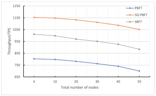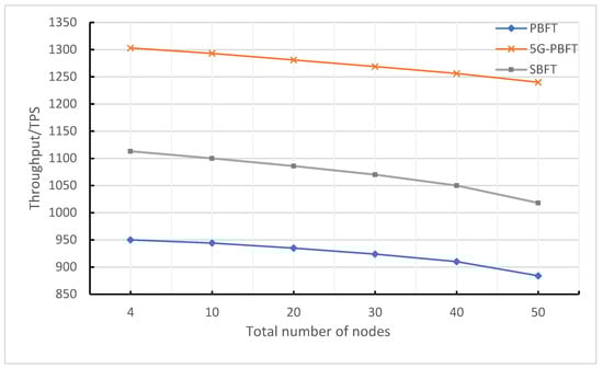 It can be concluded that regardless of whether there are Byzantine nodes in the blockchain system, the transaction latency of PBFT and SBFT is higher than that of 5G-PBFT. The reasons are as follows: In the PBFT consensus process, nodes need to communicate with each other in the prepare phase and commit phase, and the time complexity is . SBFT optimizes the communication process compared to PBFT. However, the commit phase still needs to be performed, which greatly increases the time required for transaction confirmation. In 5G-PBFT, nodes do not need to communicate with each other, but through the primary node. The time complexity can be reduced to without view changes. So, the commit phase is omitted to further reduce the time required for transaction confirmation. For instance, in the case of no Byzantine nodes, when the number of nodes is 50, the transaction latency of 5G-PBFT is 63.6% lower than that of PBFT and 36% lower than that of SBFT.