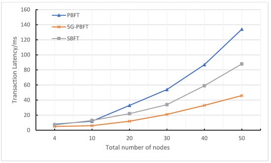 Regardless of whether there are Byzantine nodes or not, the transaction latency of the three algorithms increases as the number of nodes becomes larger. This is because when the number of nodes increases, the number of communications between nodes during consensus also becomes larger. In addition, the 5G-PBFT transaction latency has the smallest increase as the number of nodes becomes larger. This shows that the proposed algorithm is highly scalable.