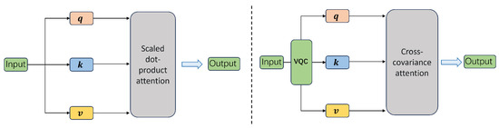 In the self-attention mechanism, the commonly used method for calculating similarity is dot product, but this significantly increases both time and space complexity. For spatiotemporal data, using the cross-covariance matrix to calculate similarity is more efficient. This not only reduces model complexity but also simplifies the training process while maintaining prediction accuracy. Cross-covariance is a tool for measuring the degree of association between different variables. A positive value indicates a positive correlation, and a negative value indicates a negative correlation; additionally, the larger the absolute value, the stronger the association. A value of zero indicates no correlation. Unlike covariance, which is used for a univariate analysis, cross-covariance is used for analyzing relationships between multiple variables and is widely applied in statistics and signal processing fields. For instance, a cross-covariance matrix can effectively measure the similarity between signals and can be used to infer unknown characteristics from known signals. Therefore, to calculate similarity using a cross-covariance matrix, the computational formula shown in Equations (1) and (2) is used. In this equation, and represent the normalized key and query matrices, respectively. This normalization helps to enhance the stability of the training process. Additionally, is the scaling factor, which assists in distributing the attention weights more evenly.