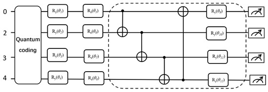 The numbers represent qubit indices, while are trainable parameters of quantum gates (such as and ) used to adjust quantum states. Through these rotation and controlled gates, the circuit performs feature mapping and quantum computation to enhance data representation.