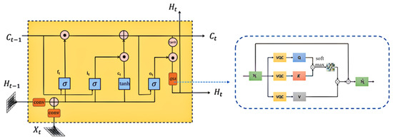 The internal computational methods for each state in the QSA-ConvLSTM model are described in Equations (3)–(10). Here, QSA refers to the quantum self-attention module, and and represent the features aggregated by the QSA module. The computational steps are as follows:
