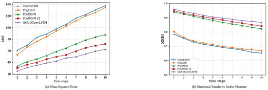 Figure 7 illustrates the trends of the evaluation metrics over 10 time steps. In the figure, (a) represents the MSE metric, while (b) represents the SSIM metric. As the time steps progress, the prediction performance of all models gradually deteriorates, indicated by an increasing trend in the MSE curve and a decreasing trend in the SSIM curve. However, the QSA-QConvLSTM model exhibits a clear advantage over the other models, as its MSE metric increases at a slower rate, and its SSIM metric decreases at a slower rate.