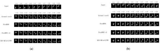 To provide a more intuitive demonstration of the prediction performance of the different models, two samples from the Moving MNIST dataset were selected for a visualization analysis. Figure 8 illustrates two prediction examples. In the figure, Input represents the first 10 input frames, and Ground Truth represents the actual subsequent 10 frames. In Figure 8, it is evident that the QSA-QConvLSTM model predicts the shapes and evolution patterns of digits more accurately than the other models. For instance, in Figure 8b, during the last five frames of the input sequence, the PredRNN and PredRNN v2 models fail to recognize the digit “8”, mistakenly identifying it as the digit “5”. By contrast, the QSA-QConvLSTM model successfully separates the digits and achieves a higher prediction accuracy.