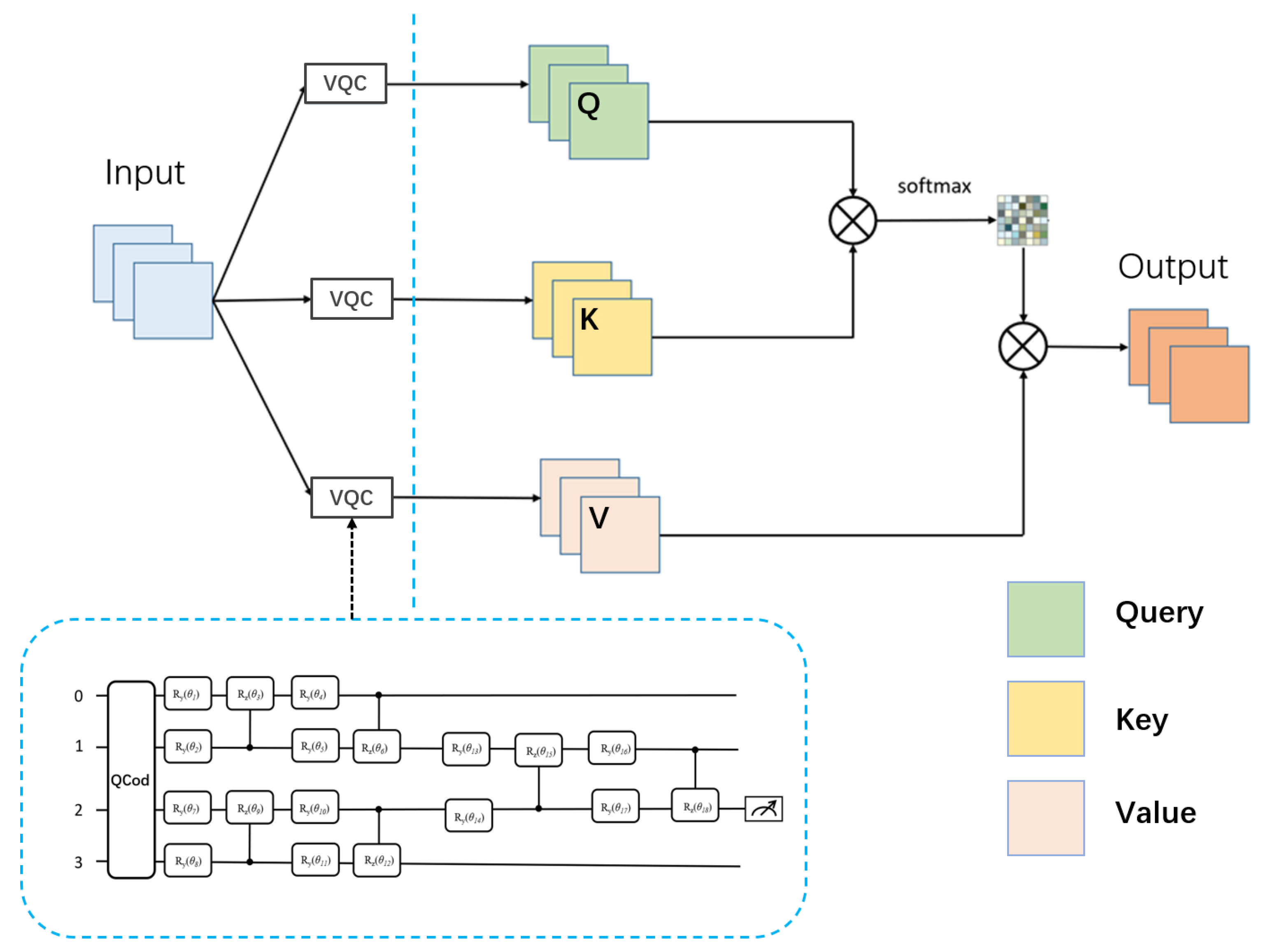 In the self-attention mechanism, mapping from the input to the query, key, and value vectors is typically achieved through linear transformations, where the input data are projected into different subspaces using weight matrices. This method is widely used in fields such as natural language processing (as shown on the left side of Figure 2). To enhance feature representation and reduce computational complexity, this study introduces variational quantum circuits (VQCs) to replace traditional linear transformations, completing the quantumized mapping process. The specific structure of this quantumized mapping is shown on the right side of Figure 2.