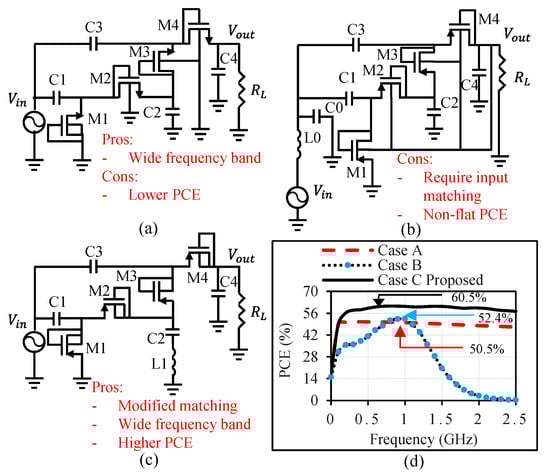 Two-stage Dickson (voltage doubler) circuit for comparing the effect of the biasing technique and matching technique: (a) inductor-less nMOS native rectifier (case A), (b) pMOS body-biasing from the output voltage (case B), (c) modified matching, pMOS transistor body-biasing from the drain side (Case C proposed), and (d) PCE versus frequency from (a–c). The values of the inductors, capacitors, and transistors dimensions are as follows: 13.5 nH, 7.24 nH, 550 fF, 25 pF. The transistor widths are μm, width of μm, with all transistors having a length of 0.18 μm in all three cases.