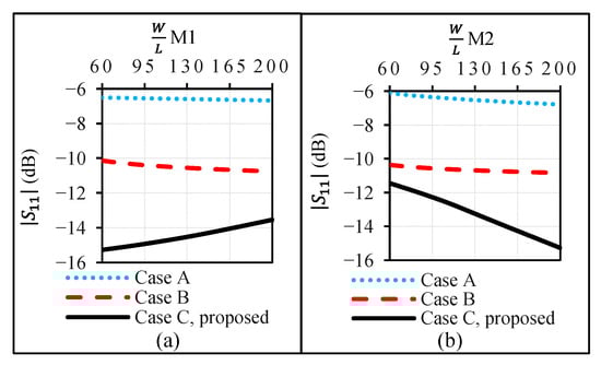 Figure 2 illustrates the impact of the transistor sizing on the reflection coefficient . The proposed design (Case C) achieves a lower compared to Cases A and B across various W/L ratios, indicating better impedance matching. This improvement is attributed to the optimized matching network, which effectively reduces the input impedance variations and enhances the power transfer efficiency. In the RF rectifier design, achieving a lower is crucial for minimizing the power losses due to reflection, thereby improving the overall power conversion efficiency (PCE). Compared to traditional inductor-less designs, our modified matching approach provides a more stable impedance profile, leading to superior performance under varying input conditions. Figure 3 provides the relationship between transistor width and PCE for different rectifier topologies. The new design always offers a higher PCE for every ratio, with the best point where efficiency is the highest. This is due to the influence of the ratio on the transistor transconductance (), which influences the conduction losses as well as the switching behavior. An increase in the ratio increases gm, decreasing Ron and enhancing the current conduction. However, at a certain stage, the oversized transistor contributes to higher parasitic capacitances, degrading high-frequency operation. The compromise proves the imperative of prudent transistor sizing in designing an RF rectifier. The outcome is in accordance with the previous literature on CMOS rectifiers that states that a tradeoff between the efficiency of conduction and parasitic loss is accountable for providing a high PCE.