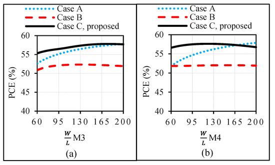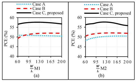 Simulated ratio versus the PCE value for the transistor (a) M1 and transistor (b) M2 at the optimal center frequency () of 0.7 GHz for three cases.