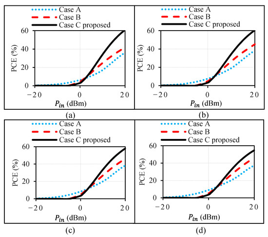 Comparison for the simulated PCE value versus input power at (a) 1.15 KΩ, (b) 1.65 KΩ, (c) 2.15 KΩ, and (d) 2.65 KΩ.