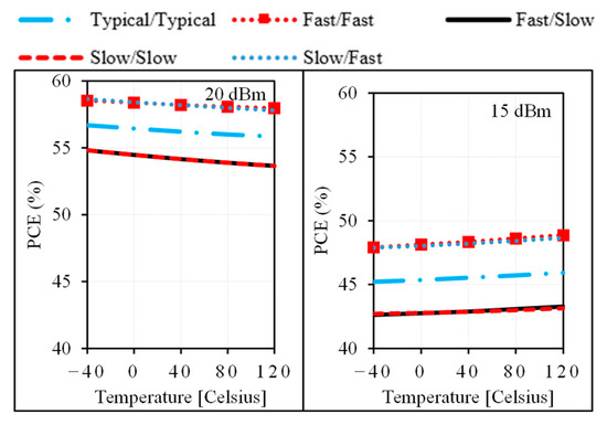 To further evaluate the robustness of the proposed design, we analyzed the impact of temperature and process variations on PCE. Figure 6 indicates that PCE decreases with an increase in temperature, demonstrating the degradation in performance due to increased thermal effects. The impact is worse at higher input power levels (20 dBm) compared to 15 dBm, where the efficiency drops consistently across the −40 °C to 120 °C temperature range. The simulation also considers the impact of different process corners, i.e., typical/typical, fast/fast, slow/slow, fast/slow, and slow/fast variations. The PCE is maximum for the fast/fast process, while the minimum efficiency is obtained for the slow/slow process, demonstrating the significance of manufacturing variations on the performance of the rectifier. Furthermore, at low input powers, PCE is more susceptible to process variation, which means design consideration must be careful in order to realize stable efficiency over different environmental and fabrication conditions.