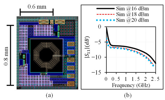 The proposed rectifier layout was implemented using 180 nm CMOS technology (PDK is by TSMC, Taiwan), occupying an active area of 0.6 mm × 0.8 mm, as illustrated in Figure 7a. Post-layout simulation of the parameter was also performed, with the results shown in Figure 7b. The rectifier exhibited excellent performance, maintaining values below −8 dB across the frequency range of 0.1 to 2.5 GHz for input power levels of 16, 18, and 20 dBm under optimal load resistance conditions.