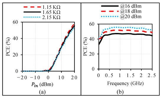 (a) Post-layout simulation peak PCE value versus input power at different load resistance value for 700 MHz frequency; (b) post-layout simulation PCE versus frequency at different input powers with 1.15 KΩ load resistance.