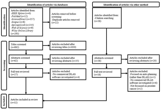 The selection criteria in Table 1 were determined based on the purpose of this review which included appraisal of methods of original studies on evaluating the performance of DLAS software for the PCa RT planning [22,23,24,25,27]. For systematic reviews of DL that covered the study methodology appraisal, the conference proceedings were considered not suitable due to their lower academic rigour in general [22,27,28]. The detail of article selection is illustrated in Figure 1 [22,23,24,25]. The main processes included article deduplication and screening of paper titles, abstracts, and full texts as per the selection criteria. Each non-duplicate paper in the search results was retained unless a decision on its exclusion could be reached. Reference lists of all included papers were checked for identification of additional articles (i.e., backward reference searching) [22,23,24,29,30].