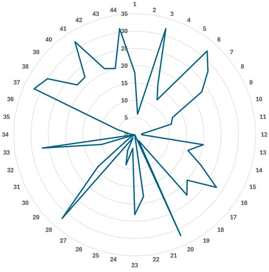Nearly 80.0% (25/32) of the included papers were published in the previous three years (Table 4) [37,38,39,44,45,46,48,49,50,51,53,54,55,56,57,58,59,60,61,62,63,65,66,67,68]. However, these articles had some methodological weaknesses, e.g., only two (6.3%) prospective [42,44] and four (12.5%) multi-centre studies [42,49,52,58], none with sample size calculation for testing dataset [37,38,39,40,41,42,43,44,45,46,47,48,49,50,51,52,53,54,55,56,57,58,59,60,61,62,63,64,65,66,67,68], 84.4% (27/32) of the papers with fewer than 100 patients for software testing [37,38,39,41,42,43,44,45,46,47,48,49,50,51,52,54,55,56,59,60,61,62,63,64,65,66,68] (even four studies with ≤ 10 patients [44,46,55,62]), etc. Nevertheless, 27 out of the 32 (84.4%) articles performed the external testing [38,39,40,41,42,43,44,45,47,48,49,50,52,53,54,55,57,58,59,60,61,62,64,65,66,67,68]. In addition, the model testing datasets of the included articles (except Radici et al. not specifying the source [46]) were obtained from 14 different countries [37,38,39,40,41,42,43,44,45,47,48,49,50,51,52,53,54,55,56,57,58,59,60,61,62,63,64,65,66,67,68] on four continents: Asia [47,52,55,60,68], Australia [50], Europe [40,44,45,48,49,52,53,54,56,58,59,61,62,63,66], and North America [37,38,39,41,42,43,51,57,64,65,67]. The mix of the merits and deficiencies of these papers resulted in their quality scores between 40.0% and 72.0% (mean: 52.1% and median: 53.0%) [37,38,39,40,41,42,43,44,45,46,47,48,49,50,51,52,53,54,55,56,57,58,59,60,61,62,63,64,65,66,67,68]. Figure 2 shows the number of included articles meeting each revised CLAIM 2024 criterion [36].